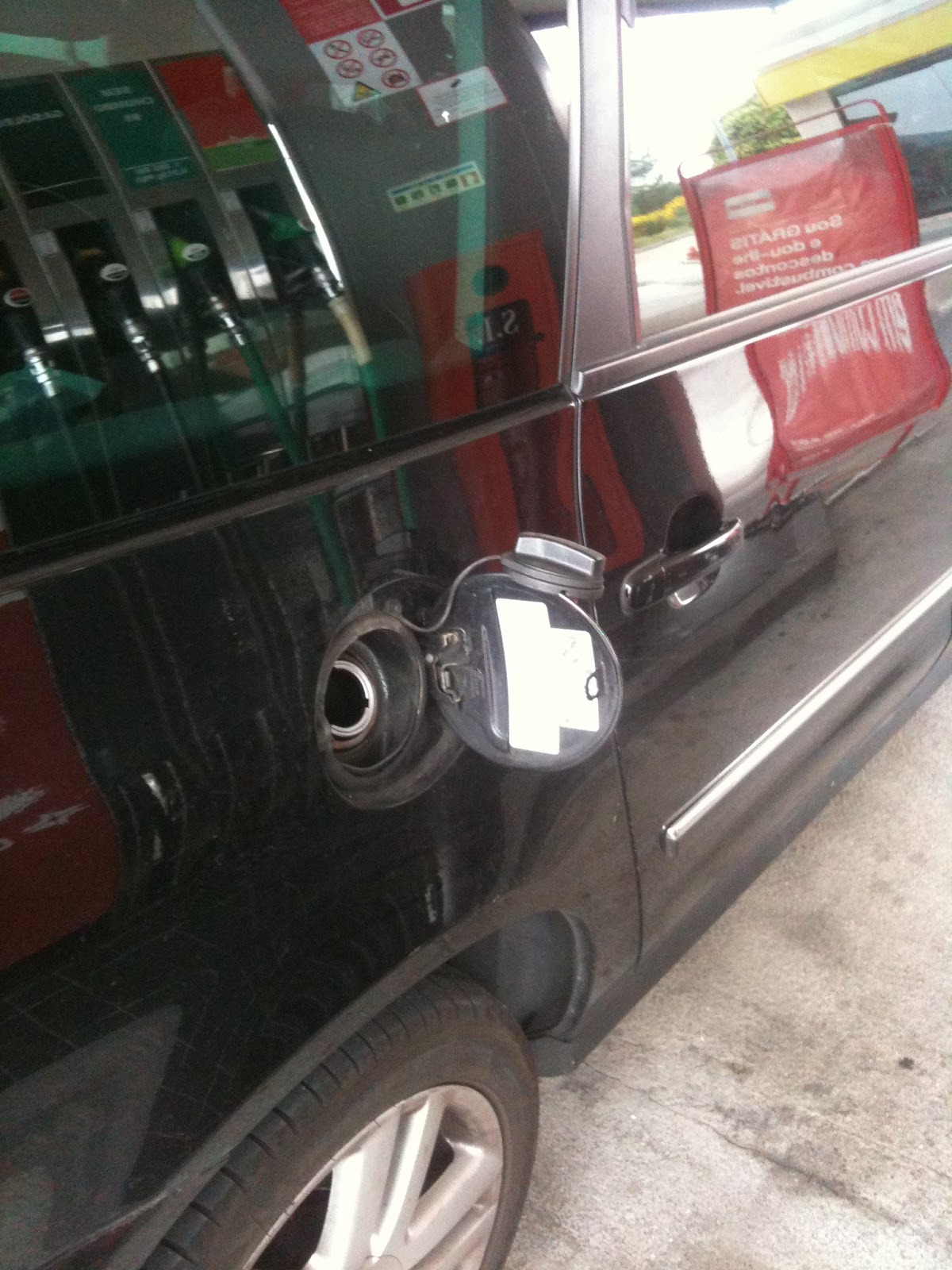 No domingo, quando íamos a caminho de Portalegre, precisámos de parar numa estação de serviço para meter gasóleo, tarefa que ficou a cargo do senhor pai. Quando já estava tudo pronto para partir, eu tive de sair do carro para procurar a chucha da Rita, que andava perdida no banco de trás, e eis senão quando... isto: