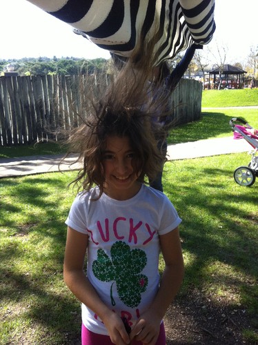 Nós decidimos hoje almoçar em Monsanto, em modo piquenique. Uma das mantas que levámos era de lã, e na hora de sacudir a Carolina resolveu meter-se debaixo dela. Graças a isso, ficou com o melhor penteado de todos os tempos.